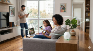 Um sistema Mesh Wi‑Fi é uma rede formada por vários pontos (nodos) que trabalham juntos para distribuir o sinal por toda a casa — de forma contínua, sem precisar ficar conectando manualmente a diferentes redes em cada cômodo. Isso cria um “tapete” de sinal uniforme, permitindo que seu celular, computador ou TV se conectem de forma automática ao ponto mais próximo com melhor sinal.